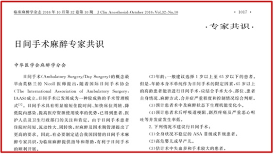 早在2016年8月25日在广州由中南大学湘雅医院麻醉科主任郭曲练教授组织与主持召开了中国《日间手术麻醉专家共识》定稿会,就日间手术麻醉流程、病人的选择与评估、麻醉方法选择、术后镇痛、术后恶心呕吐和术后病人康复等问题达成一致意见。