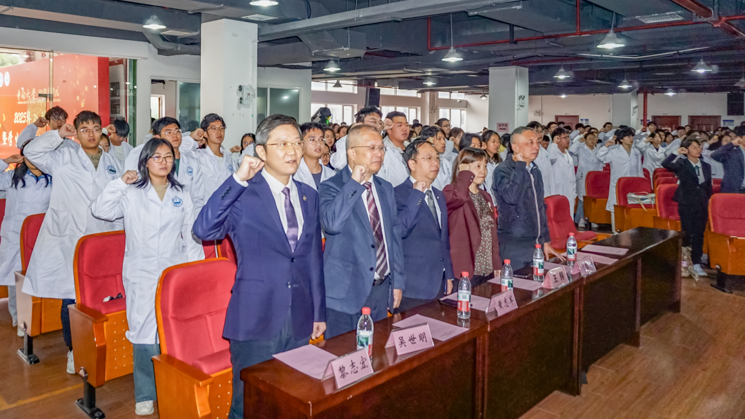 在热烈的掌声中,中南大学党委常委、常务副校长、湘雅医学院院长陈翔教授为各班学生代表授予了象征纯洁与责任的医学生白大褂。一袭白衣,不仅是职业身份的象征,更代表着百年湘雅“公勇勤慎、诚爱谦廉”的精神血脉,承载了百余年来湘雅人“救死扶伤”的无悔承诺。它是沉甸甸的责任,也是崇高的信仰,更是以仁心仁术点亮生命的无声誓言。