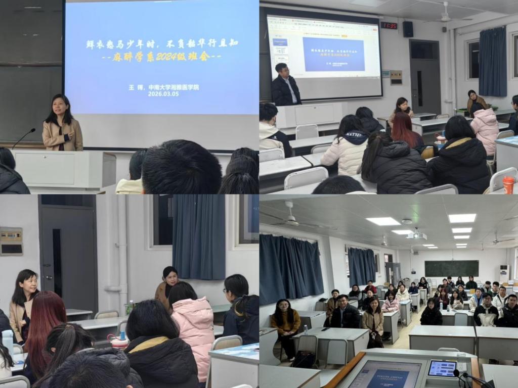 为进一步加强班级建设,帮助同学们更好地适应专业学习节奏、明确未来职业方向,2026年3月5日,在学院统一组织下,湘雅医学院麻醉学系2024级学生召开了新学期班会。本次班会围绕学业规划、日常生活管理、班级建设以及麻醉专业发展等内容开展交流与指导。班会由班导师王露老师和辅导员封晨阳老师主持,并邀请麻醉学系主任王锷教授、湘雅医院麻醉科副主任宋宗斌教授和李龙艳副教授参加,与同学们面对面交流。
