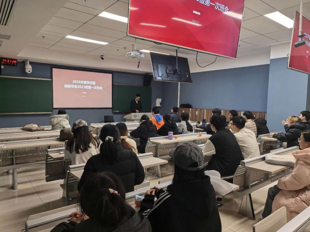 3月7日下午,湘雅医学院麻醉学系2023级学生在湘雅医院教学科研楼101教室召开春季学期第一次班会。湘雅医院麻醉科副主任宋宗斌教授及李龙艳副教授,麻醉学系2023级班导师侯新冉、班主任许芳婷老师,辅导员王开乾老师参加班会,围绕新学期学习规划、临床课程适应、学业发展等话题与同学们进行交流。